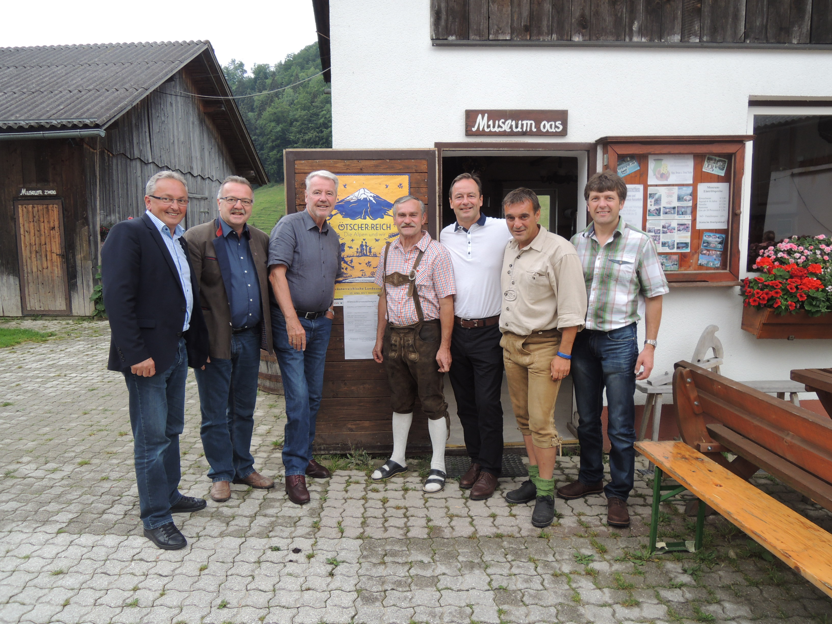 In die Landesausstellungsregion „Ötscher:Reich“ führte der diesjährige Ausflug von Mitgliedern des NÖ Landtagsclubs. Gestartet wurde im Ausstellungsgelände Frankenfels-Laubenbachmühle mit einer Grußbotschaft im Bahnhofsportal und anschließender Ausstellungsbesichtigung in der Remise. Da sich die Landesschau über drei Bezirke erstreckt, gab es quasi auch drei reiseleitende Landtagsabgeordnete: Nämlich Dr. Martin Michalitsch (St. Pölten), Karl Bader (Lilienfeld) und Anton Erber (Scheibbs). Mit der Himmelstreppe der Mariazellerbahn stieg die prominente Politikerrunde gemeinsam mit Landtagspräsident Ing. Johann Penz die Stufen nach Wienerbruck hoch. Vom dritten und letzten Ausstellungsort Neubruck führte der Weg auf den Frankenfelsberg zum Bergbauernmuseum und Mostheurigen Hausstein. Dort formierte sich ein kleines Empfangskomitee mit Bgm. Franz Größbacher, GGR Herbert Winter und den Wirtsleuten Bruno und Erna Tuder. Bei einem Begrüßungsumtrunk und einer Museumsjause präsentierten die Gastgeber den Landesausstellungsort Frankenfels von seiner Sonnenseite.