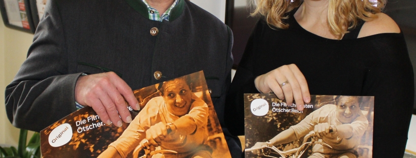 Abb.: Bürgermeister Heinz Putzenlechner und Isabella Größbacher-Stadler BA von der LEADER-Region mit den Plakaten für das Projekt „Filmchronisten“.