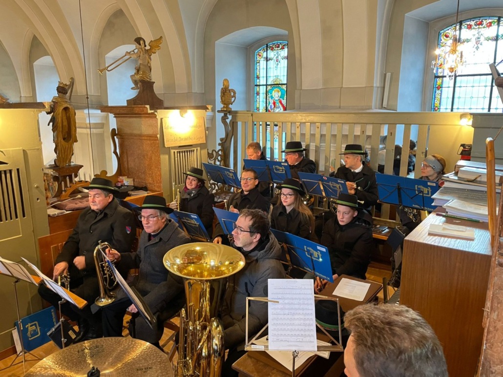 Der junge engagierte Kapellmeister Nico Grasmann und das Blasorchester haben es verstanden, Weihnachtszauber in die Kirche zu bringen. Es wurden musikalische Weihnachtswünsche aus der ganzen Welt dargeboten: „The Holy City“, eine Hymne auf Jerusalem, mit feinen Passagen im Holzregister. Die Friedensbotschaft von John Lennon „Happy Xmas“ und der Gruß aus Amerika mit „White Christmas“ von Irvin Berlin bildeten den Mittelteil der Messe. Lateinamerikanischer Rhythmus war bei „Feliz Navidad“ mit Herausforderungen am Saxofon- und Trompetenregister sowie Schlagzeug angesagt. Zum Schluss erklangen die „Schönsten Weihnachtslieder“ aus dem Alpenraum; ein Bravourstück für die traditionellen Blasmusikinstrumente Flügelhorn und tiefes Blechregister. Den krönenden Abschluss bildete traditionsgemäß das ewige Lied „Stille Nacht, Heilige Nacht“.