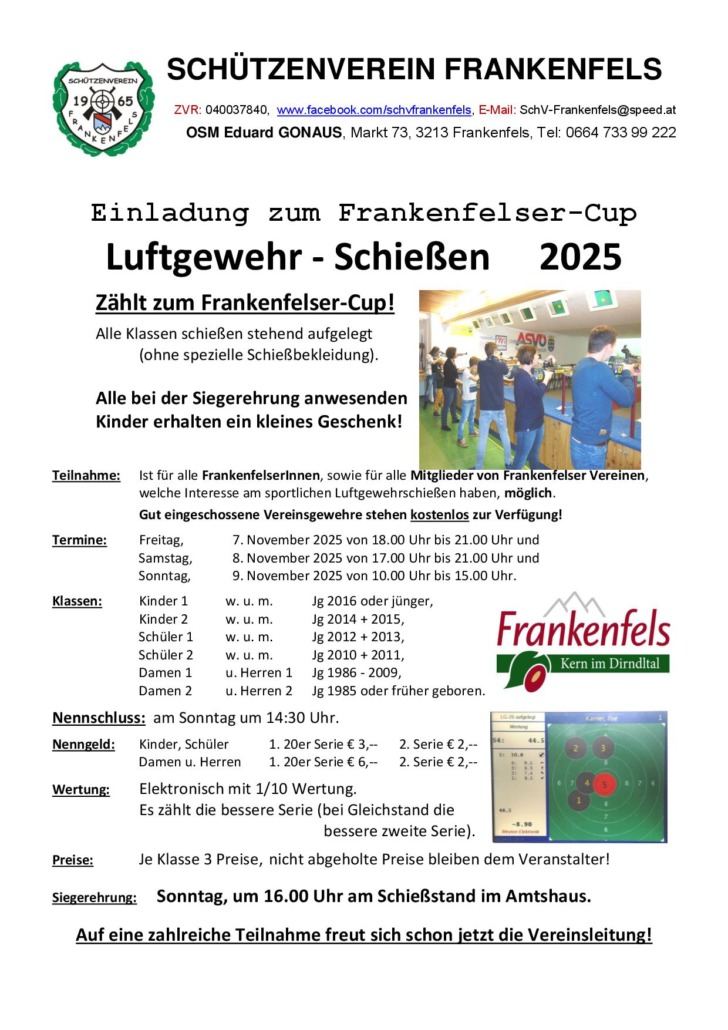 Sie sind hier: Startseite1 / News2 / Sport3 / Einladung zum Frankenfelsercup Luftgewehr-Schießen 2025!
