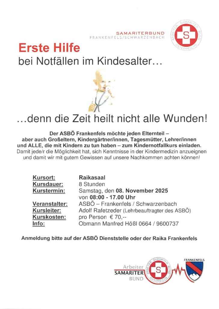 Erste Hilfe Kurs bei Notfällen im Kindesalter am Samstag, 08. November 2025