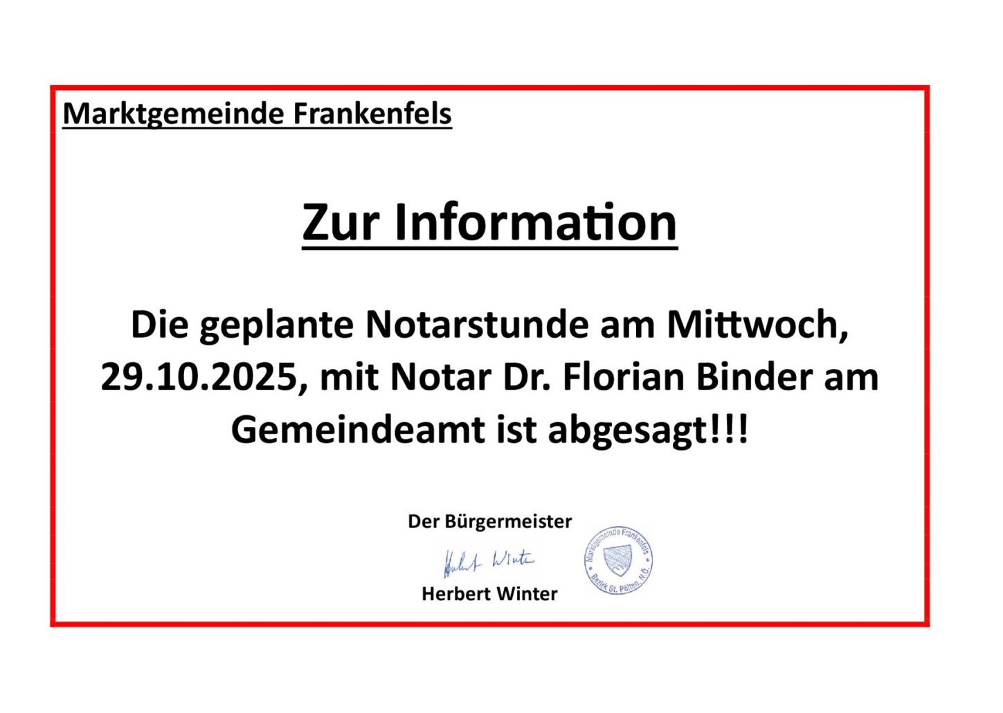 Notarstunde mit Notar Dr. Florian Binder am 29.10.2025 abgesagt!