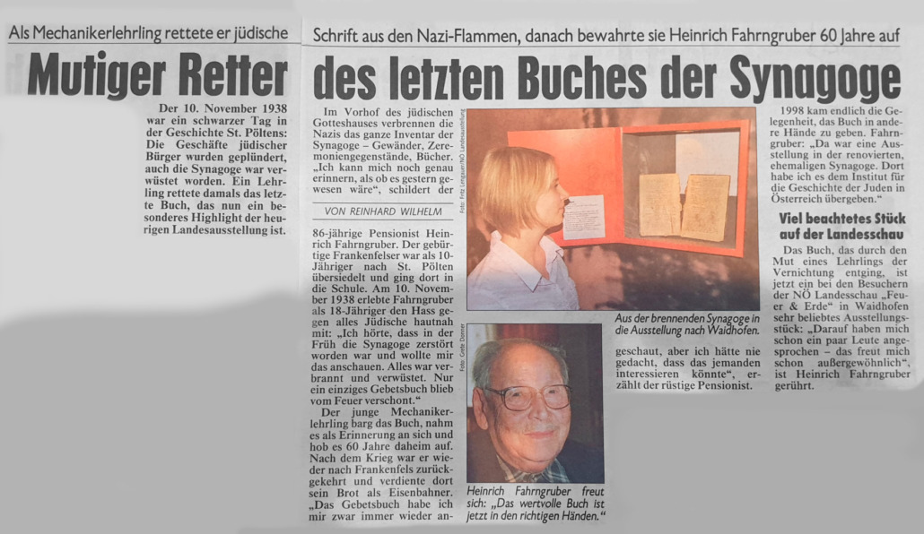 „In der Nacht von Donnerstag, 9. Nov., auf Freitag, 10. Nov., jährt sich abermals die Reichskristallnacht aus dem Jahr 1938, als jüdische Einrichtungen, Gebetshäuser, Geschäfte und Wohnhäuser zerstört, angezündet oder beschädigt wurden. Der Frankenfelser Heinrich Fahrngruber rettete damals als 18-jähriger Schlosserlehrling in der Jüdischen Synagoge in St. Pölten eine Gebetsschrift. Es dürfte das einzige Buch gewesen sein, dass damals kein Opfer der Flammen wurde. Die Synagoge wurde damals im Innenbereich komplett zerstört, alle Gewänder und Schriften verbrannt. Unser Historiker Bernhard Gamsjäger war ihm bei der Übergabe des Buches an die Israeltische Kultusgemeinde behilflich.“