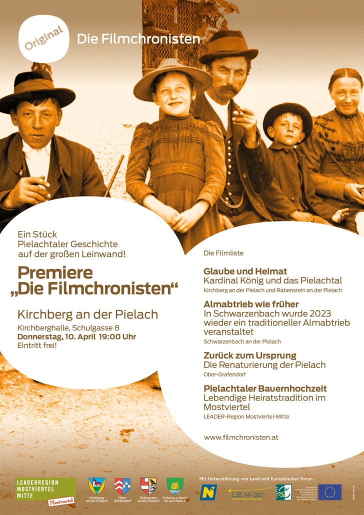 /von Isabella AigelsreiterSeit knapp fünf Jahren sind die Filmchronisten – ein Projekt der LEADER-Region Mostviertel-Mitte – in den Gemeinden unterwegs um spannende, regionale Themen, Geschichten und Traditionen mit der Kamera zu dokumentieren und so für nachfolgende Generationen festzuhalten. Auch im Pielachtal wurde wieder gedreht! Die vier entstandenen Filme werden am 10. April in der Kirchberghalle erstmals öffentlich vorgeführt.