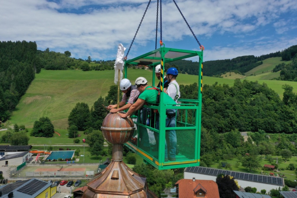 /von Isabella AigelsreiterBei Kaiserwetter wurde am 13.07.2025 feierlich die Kirchturmdachsanierung mit einer Kreuzsteckungsfeier abgeschlossen. Seit Ende April wurden die erforderlichen Arbeiten dieser aufwendigen Sanierung, Erneuerung und Ausbesserung des Dachstuhls und die Eindeckung des Daches mit Kupfer durch die Firma Wutzl, Frankenfels, die Malerarbeiten am Turm von Firma Fischer aus Obergrafendorf, durchgeführt. Zahlreiche Freiwillige, voran PKR-Mandatar Karl Hochfilzer engagierten sich bei der Sanierung. Durch Unterstützung der Marktgemeinde in der Höhe von € 5.000,– , Spenden der Bevölkerung, Verpflegung der Arbeiter, oder Mithilfe bei der Kreuzsteckungsfeier konnte dieses Projekt abgeschlossen werden. Ein großes Dankeschön an alle, die zum Gelingen beigetragen haben.