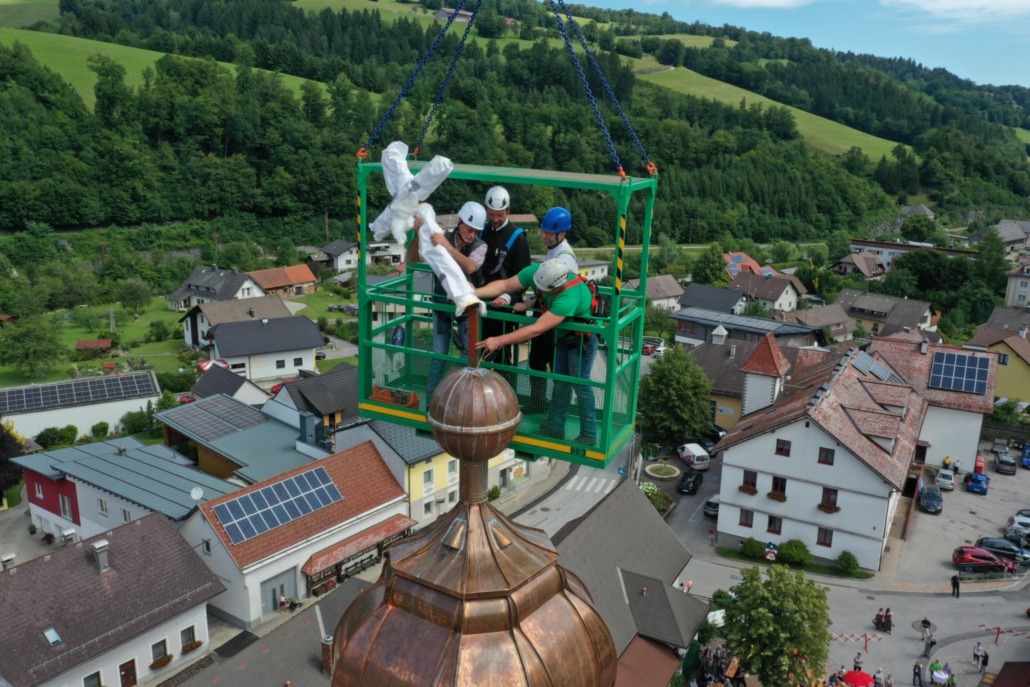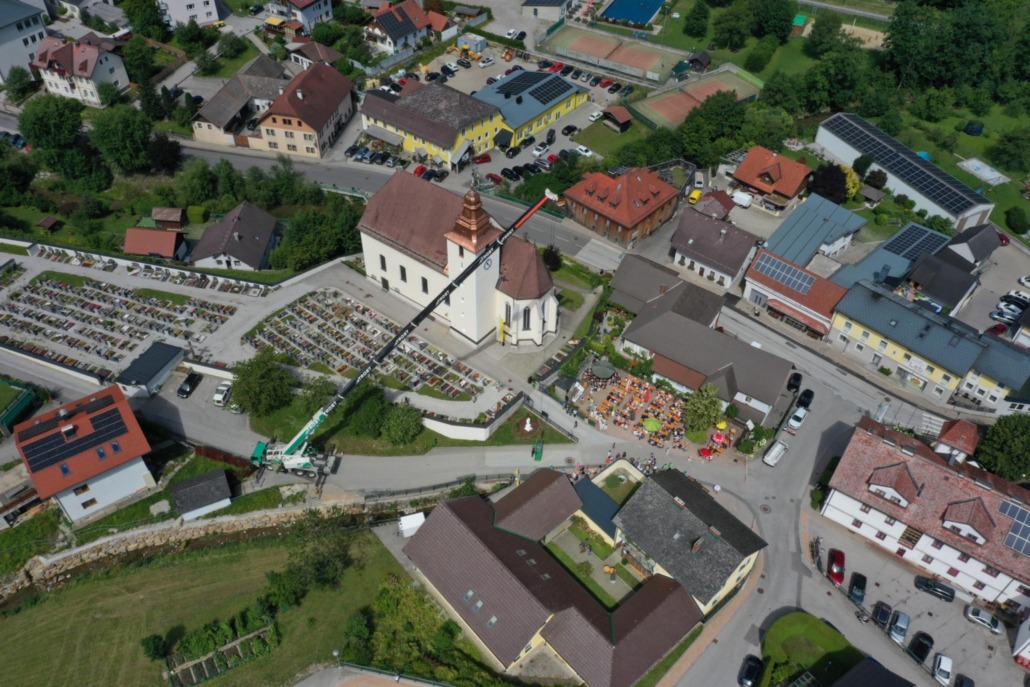 Die Feier begann am Sonntag mit dem Festgottesdienst, zelebriert von P. Altmann Wand und Generalvikar Dr. Christoph Weiss, der mit seiner Predigt die Gläubigen begeisterte. Mit einem Kran der Firma Trost, wurde das Kreuz von Generalvikar Weiss, P. Altmann und dem Spengler Peter Feichtner, in schwindelnden Höhen montiert. Zahlreiche Gäste aus Nah und Fern waren gekommen um diesen historischen Moment beizuwohnen. Zu einer gelungenen Feier trugen auch örtliche Vereine und Organisationen bei. Durch die musikalische Umrahmung, die kulinarische Versorgung und das Showprogramm der Kinder und Jugendlichen verbrachten die Gäste unvergessliche Stunden bis in den Abend.