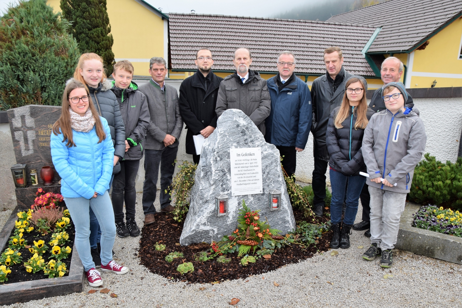 Am Sonntag, 28. Oktober, setzten die Mittelschule, die Marktgemeinde Frankenfels und die Pfarre Frankenfels ein Zeichen der Erinnerung an 14 ermordete KZ-Häftlinge vom 4. April 1945. Bereits im Jahr 1995 forschten damalige Frankenfelser Hauptschüler im Projekt „Frankenfels 1945“ und „Auf den Spuren der vergessenen Opfer“ unter maßgeblicher Führung von Dr. Ernst Langthaler in der Geschichte unseres Ortes und befragten mit Schreibblock und Aufnahmegerät Zeitzeugen, die das Kriegsende 1945 miterlebt hatten. Insbesondere das Schicksal von 14 am sogenannten „Todesmarsch“ von der KZ-Außenstelle Hinterbrühl ins KZ Mauthausen in unserem Gemeindegebiet von der SS ermordeten Zwangsarbeitern beschäftigte uns immer wieder aufs Neue. Die aus Polen, der ehemaligen Sowjetunion und aus Italien stammenden Mordopfer wurden 1946 exhumiert und am 1. Dezember 1946 im Beisein der Öffentlichkeit am Friedhof Frankenfels in einem anonymen Massengrab bestattet.