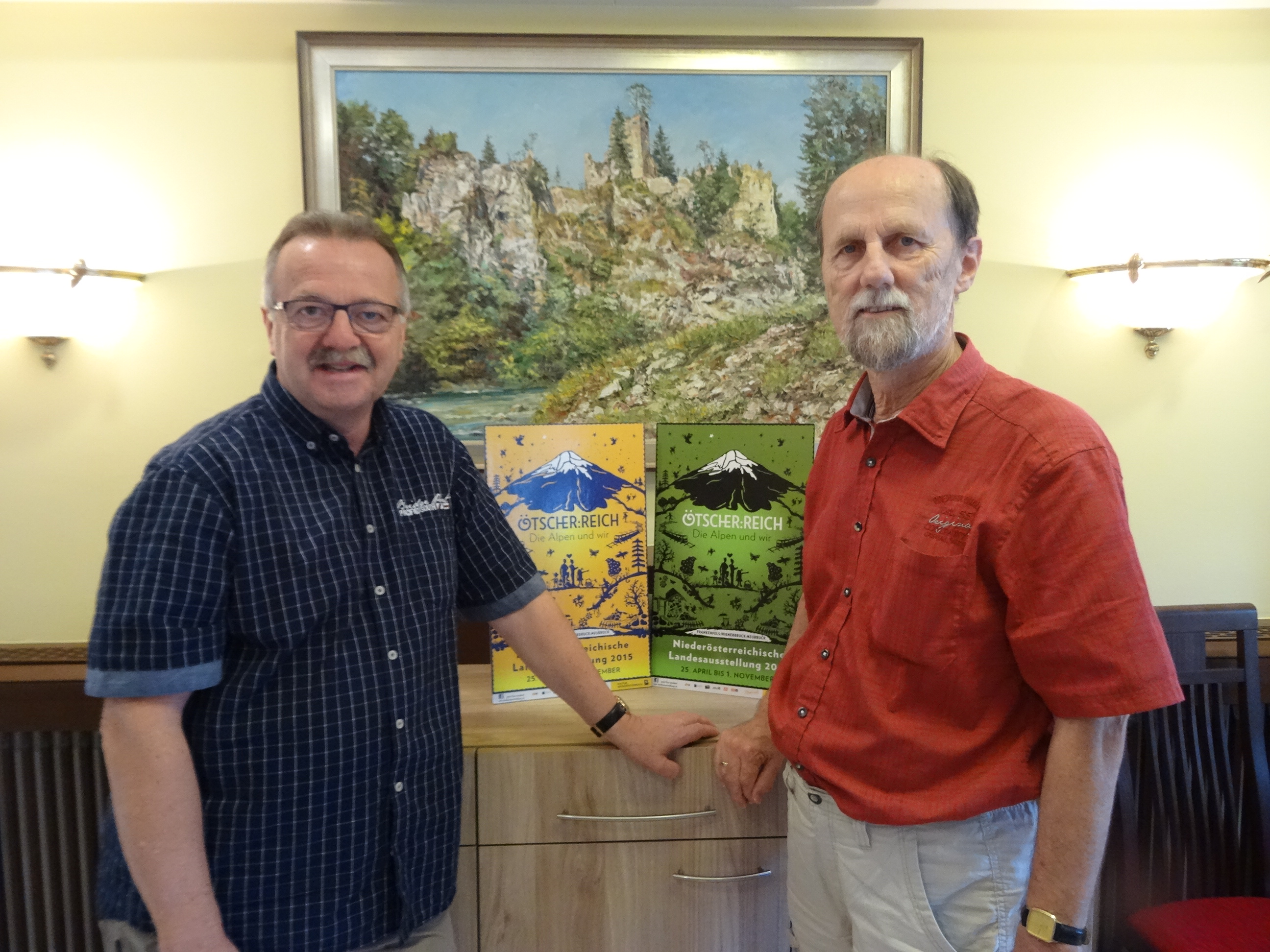 Foto: Bgm. Franz Größbacher und Burggespräch-Mastermind Dr. Bernhard Gamsjäger vor einem Weißenburggemälde von Walter Grösel aus den 1960er Jahren; damals noch als Ruine – heute eine stattliche Burg.