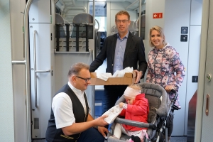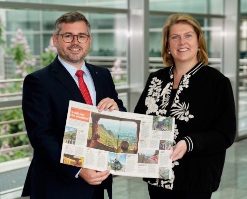 Foto: Mobilitätslandesrat Ludwig Schleritzko und NÖVOG Geschäftsführerin Barbara Komarek präsentieren stolz die Ausgabe des „The Guardian“. (© NÖVOG/Bollwein)