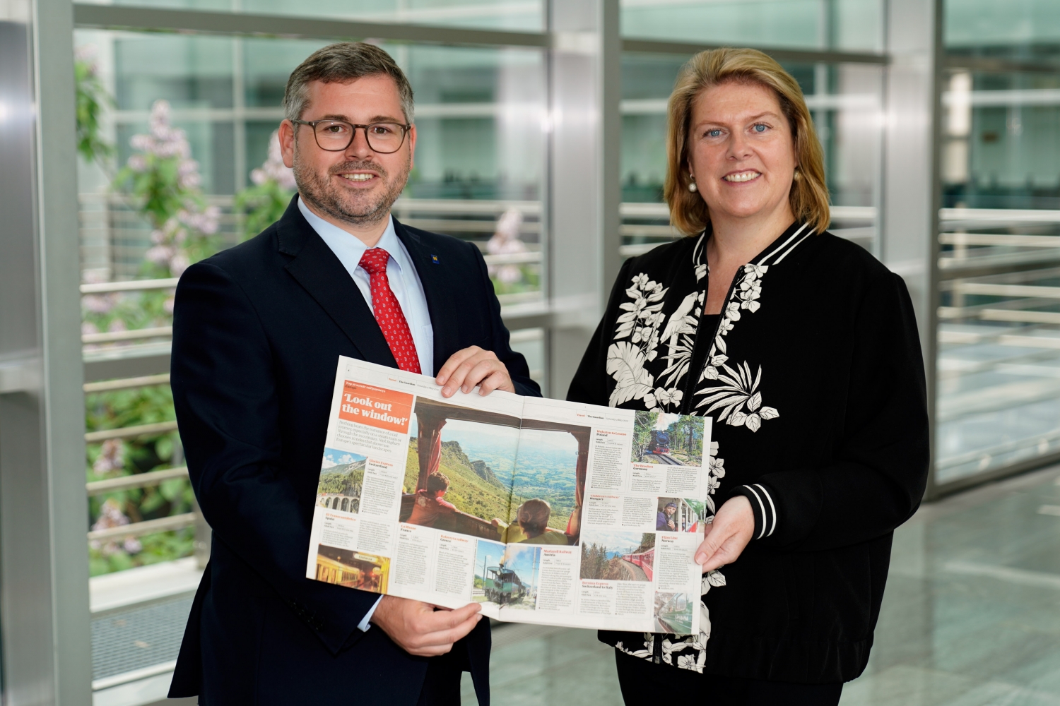 Foto: Mobilitätslandesrat Ludwig Schleritzko und NÖVOG Geschäftsführerin Barbara Komarek präsentieren stolz die Ausgabe des „The Guardian“. (© NÖVOG/Bollwein)