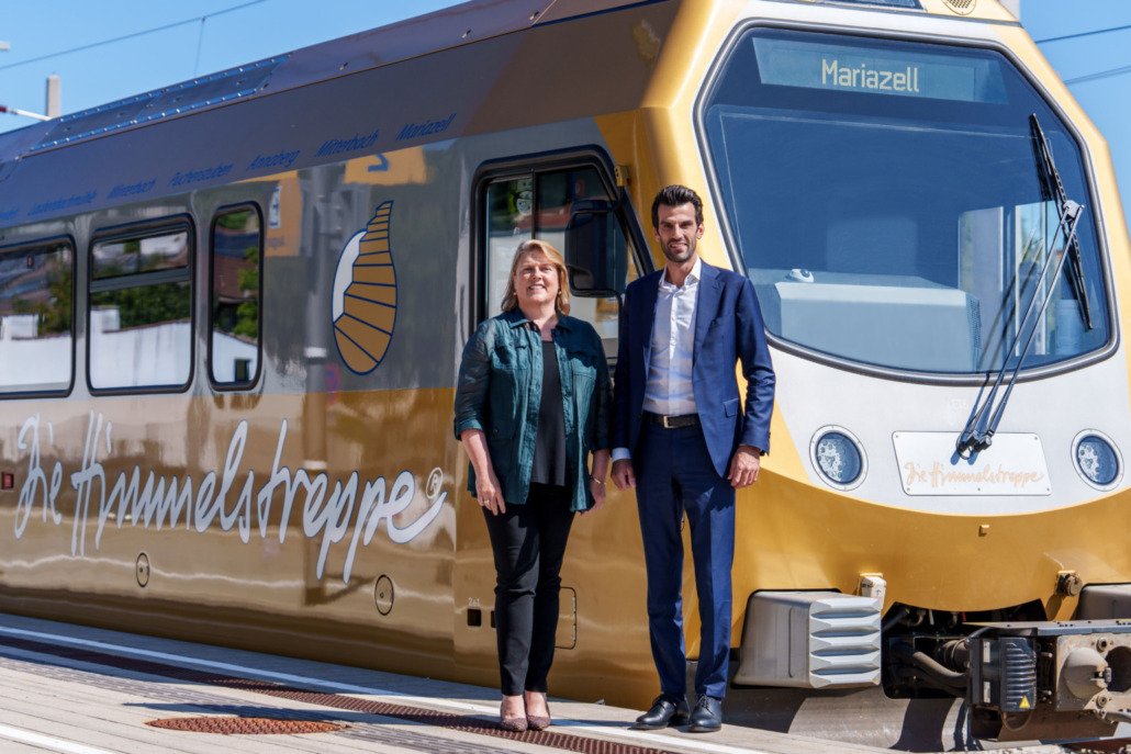 LH-Stellvertreter Udo Landbauer und Niederösterreich Bahnen Geschäftsführerin Barbara Komarek in der Mariazellerbahn. (©NB/Bollwein)