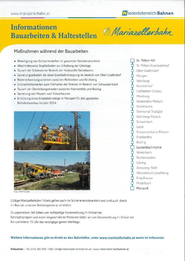 /von Nico GrasmannVon 2. bis 24. November 2023 finden bei der Mariazellerbahn zwischen St. Pölten und Mariazell die alljährlichen Herbst-Bauarbeiten statt. Die über 115 Jahre alte Schmalspurbahn wird im Sinne der Fahrgäste und der Region weiter nachhaltig fit für die Zukunft gestaltet. „Die steigende Nachfrage nach Angeboten des Öffentlichen Verkehrs verlangt regelmäßig entsprechende Investitionen in Niederösterreichs Regionalbahnen. Die Angebote des öffentlichen Verkehrs müssen den Bedürfnissen der Menschen im Land entsprechen“, betont LH-Stellvertreter Udo Landbauer.