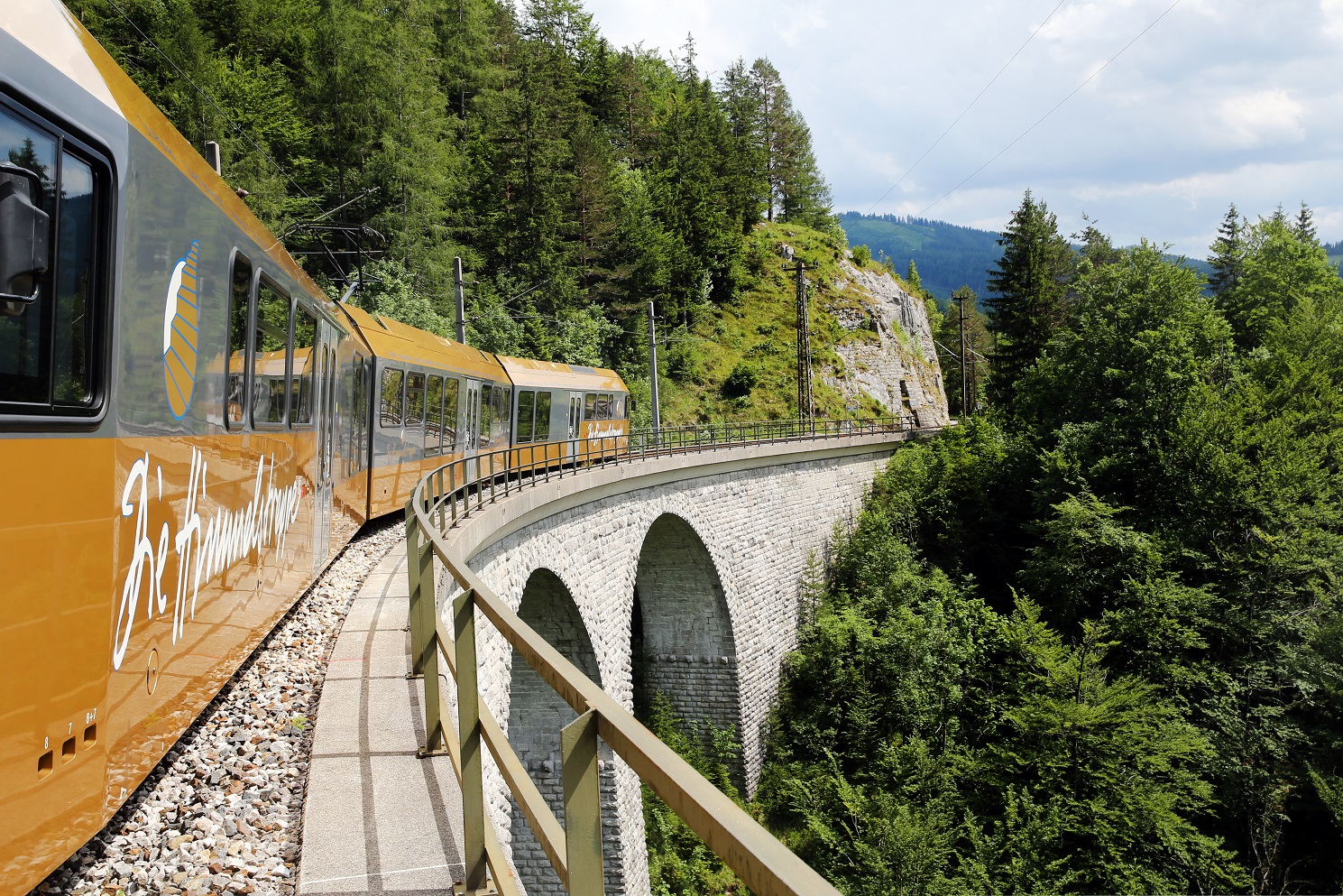 Die Himmelstreppe der Mariazellerbahn unterwegs auf dem beeindruckenden Saugrabenviadukt. (©NB/Weinfranz)