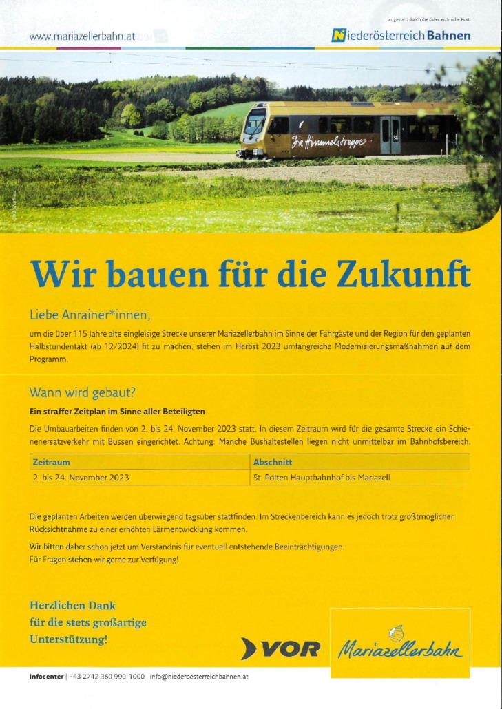 /von Nico GrasmannVon 2. bis 24. November 2023 finden bei der Mariazellerbahn zwischen St. Pölten und Mariazell die alljährlichen Herbst-Bauarbeiten statt. Die über 115 Jahre alte Schmalspurbahn wird im Sinne der Fahrgäste und der Region weiter nachhaltig fit für die Zukunft gestaltet. „Die steigende Nachfrage nach Angeboten des Öffentlichen Verkehrs verlangt regelmäßig entsprechende Investitionen in Niederösterreichs Regionalbahnen. Die Angebote des öffentlichen Verkehrs müssen den Bedürfnissen der Menschen im Land entsprechen“, betont LH-Stellvertreter Udo Landbauer.