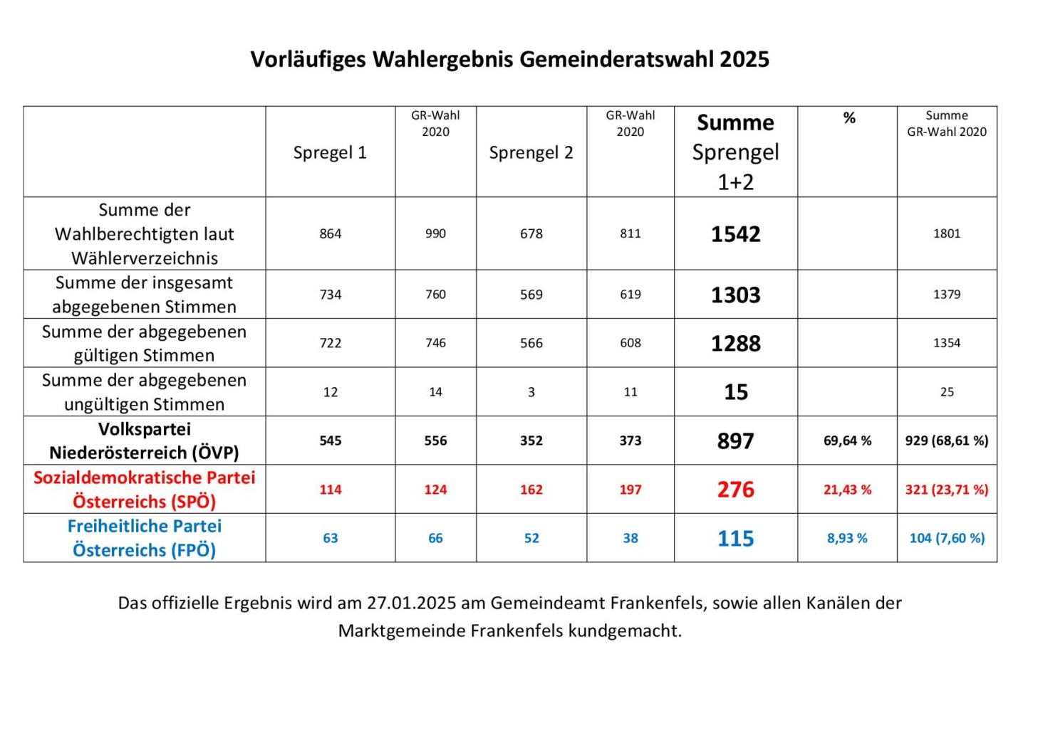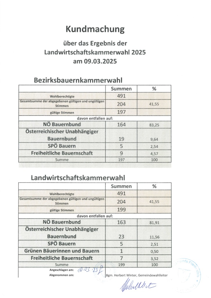Die offizielle Kundmachung zum Wahlergebnis der Gemeinderatswahl 2025 in Frankenfels
