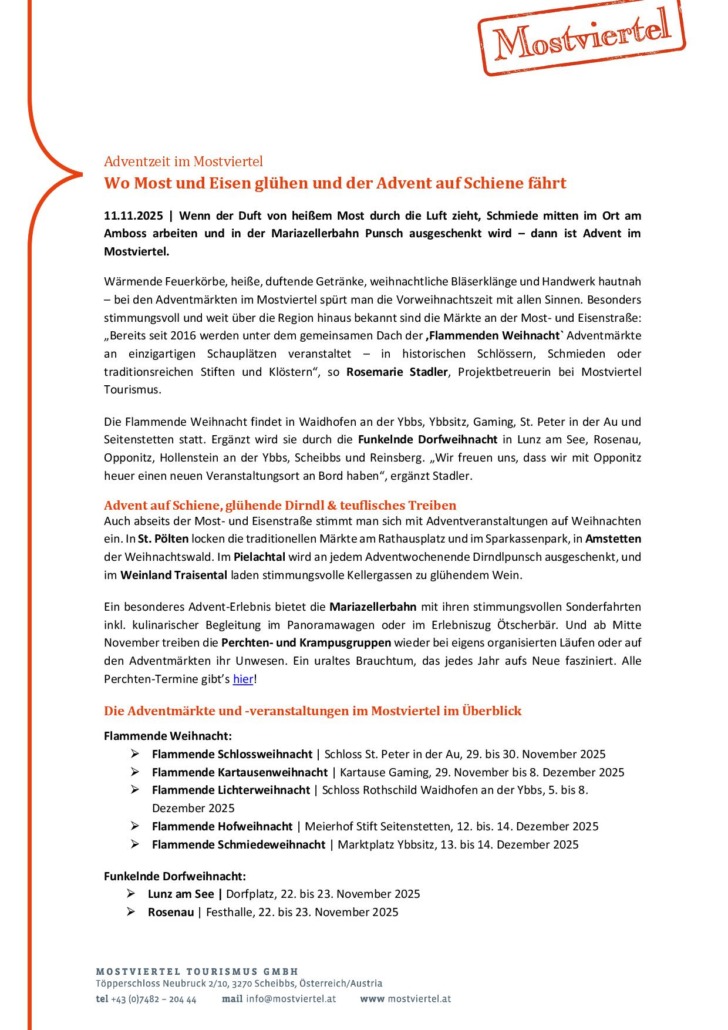 /von Daniela KarnerWenn der Duft von heißem Most durch die Luft zieht und Schmiede mitten im Ort am Amboss arbeiten – dann ist Advent im Mostviertel. Besonders stimmungsvoll und weit über die Region hinaus bekannt sind die Märkte an der Most- und Eisenstraße unter dem Dach der „Flammenden Weihnacht“. Aber auch andernorts stimmt man sich auf den Advent ein – egal ob in St. Pölten, im Pielachtal, Traisental oder in der Mariazellerbahn.