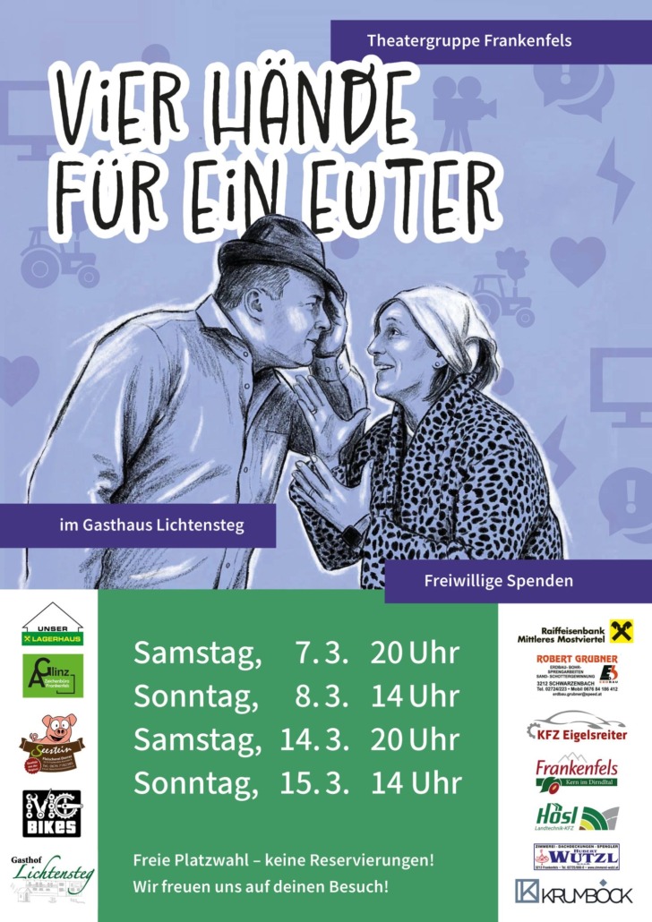 Theatergruppe Frankenfels „Vier Hände für ein Euter!“Sie müssen den Inhalt von reCAPTCHA laden, um das Formular abzuschicken. Bitte beachten Sie, dass dabei Daten mit Drittanbietern ausgetauscht werden.