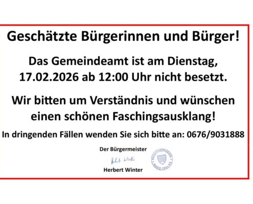 Nico Grasmann2026-02-16 16:21:362026-02-16 16:21:36Gemeindeamt am Faschingsdienstag ab 12:00 Uhr nicht besetzt